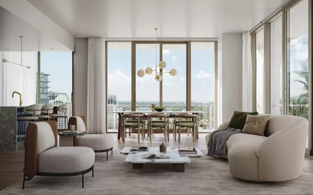 Los interiores espaciosos y llenos de luz con techos altos de 10 pies combinan un estilo moderno con un estilo europeo atemporal. Los detalles de diseño magistralmente elaborados incluyen cocinas personalizadas con gabinetes italianos y encimeras de terrazo y cuarzo. La mayoría de las residencias cuentan con terrazas privadas ideales para desayunar al aire libre. Las ventanas del piso al techo muestran una variedad de vistas panorámicas de Coconut Grove, la bahía y el brillante horizonte del centro de Miami.